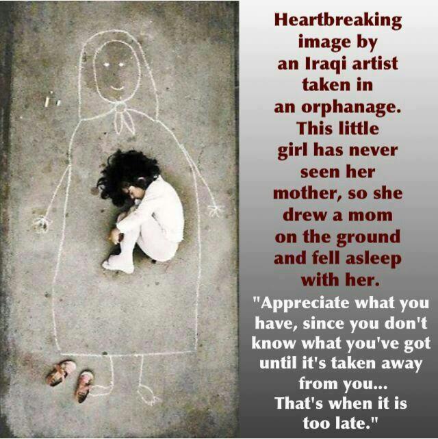 May 12, 2013 · A heartbreaking image by an Iraqi artist taken in an orphanage. This little girl has never seen her mother, so she drew a mom on the ground and fell asleep with her.