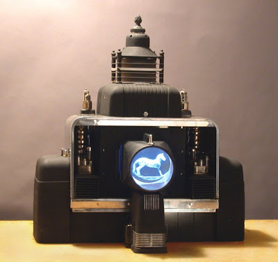 Gompf’s mixed media sculptures are comprised of found objects that appear to be authentic examples of early transmission technology. On the screens, Gompf plays digitally manipulated and reanimated photographic motion studies by Eadweard Muybridge. Right image: Steve Gompf…